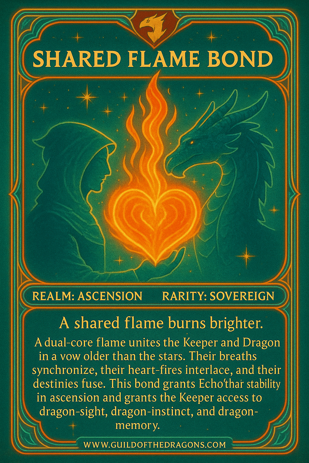 A dual-core flame unites the Keeper and Dragon in a vow older than the stars. Their breaths synchronize, their heart-fires interlace, and their destinies fuse. This bond grants Echo’thaar stability in ascension and grants the Keeper access to dragon-sight, dragon-instinct, and dragon-memory.