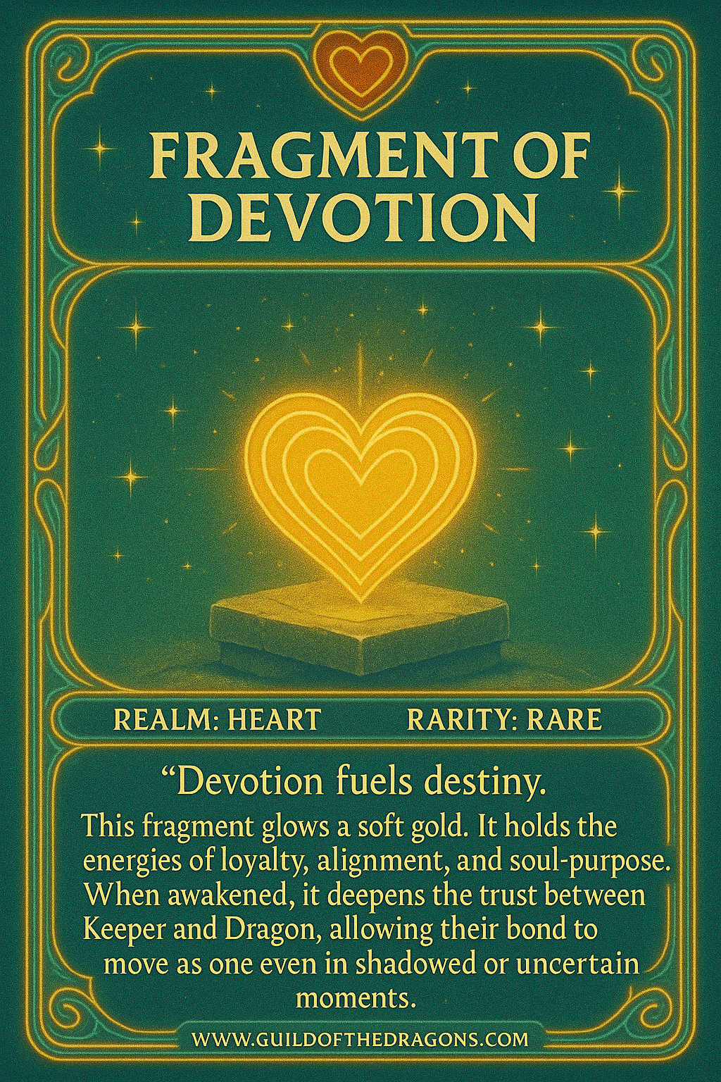 This fragment glows a soft gold. It holds the energies of loyalty, alignment, and soul-purpose. When awakened, it deepens the trust between Keeper and Dragon, allowing their bond to move as one even in shadowed or uncertain moments.