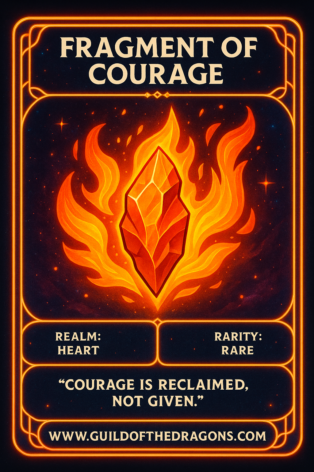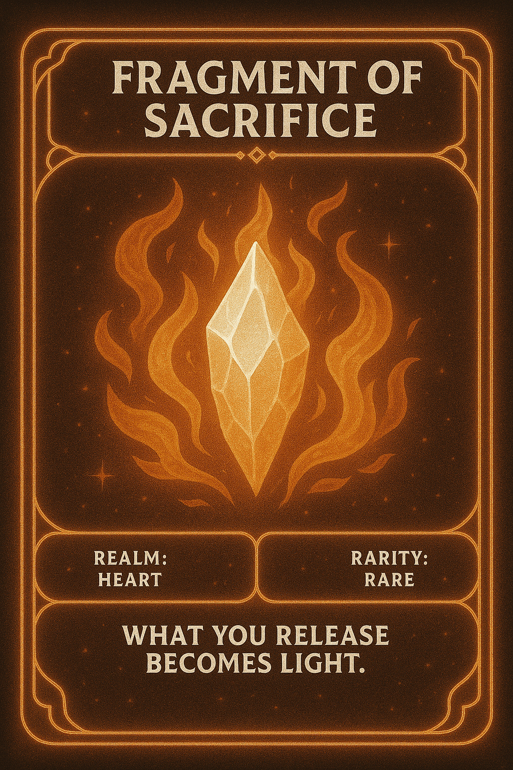 A shard forged in the inner battles the Keeper has survived. It ignites a phoenix-like spark within Echo’thaar, empowering bold action and fearless ascent. Courage becomes the bridge between pain and transformation.
