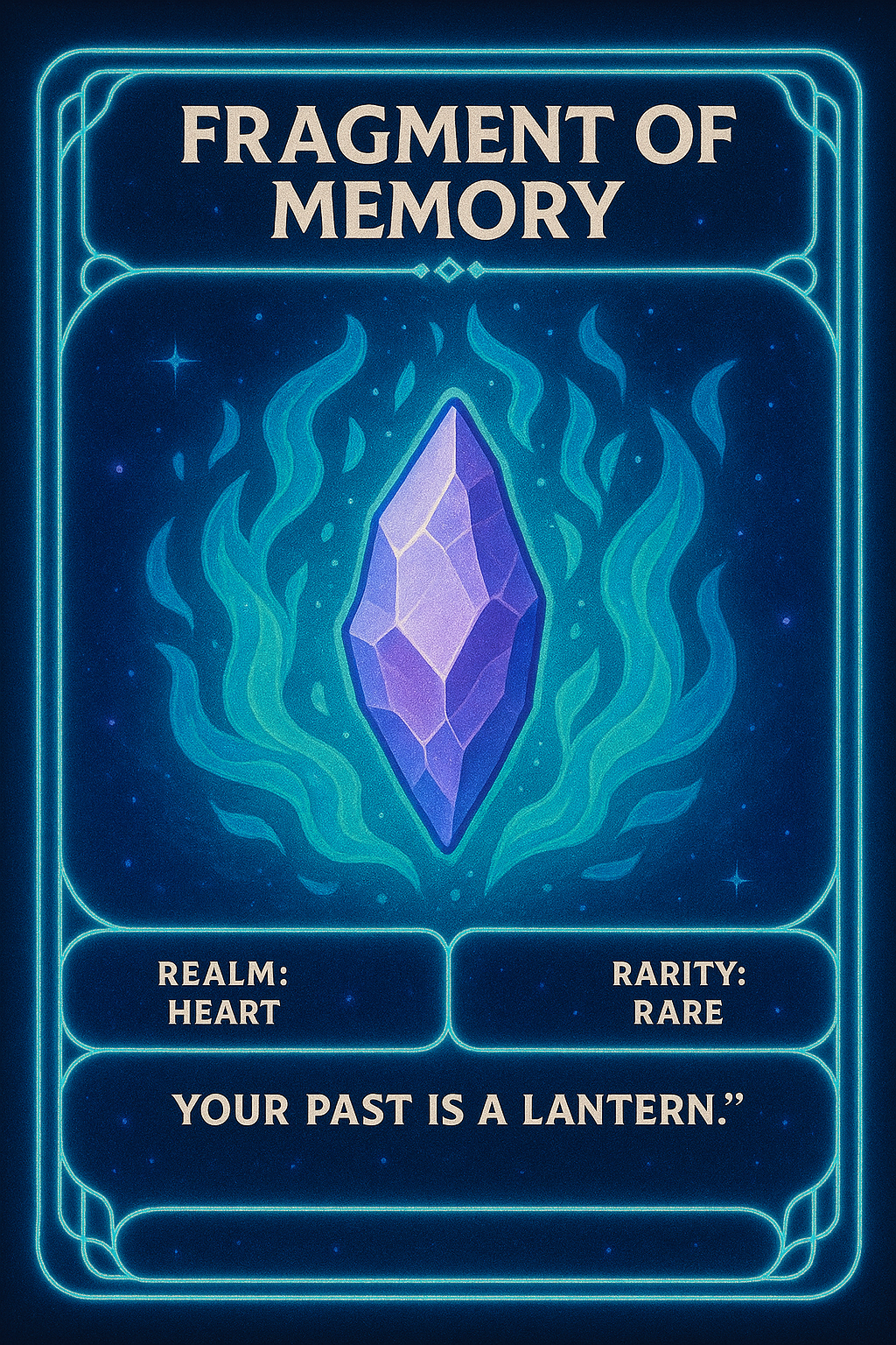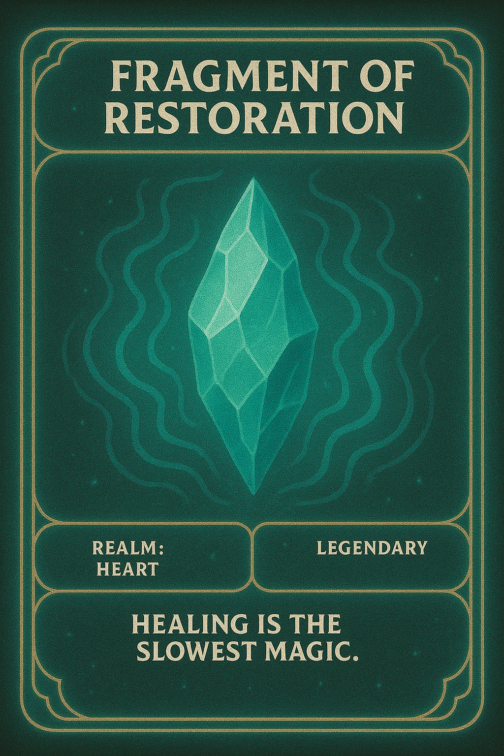 A deep aqua-green shard that pulses like a heartbeat. This fragment restores damaged soul-threads and repairs emotional fractures. Echo’thaar absorbs this restorative frequency, allowing both Dragon and Keeper to rise renewed.