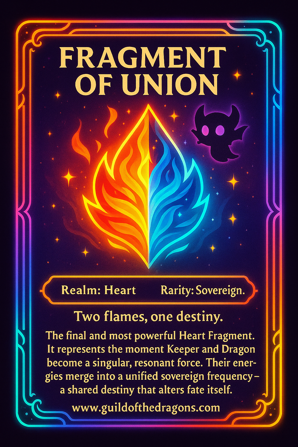 The final and most powerful Heart Fragment. It represents the moment Keeper and Dragon become a singular, resonant force. Their energies merge into a unified sovereign frequency — a shared destiny that alters fate itself.