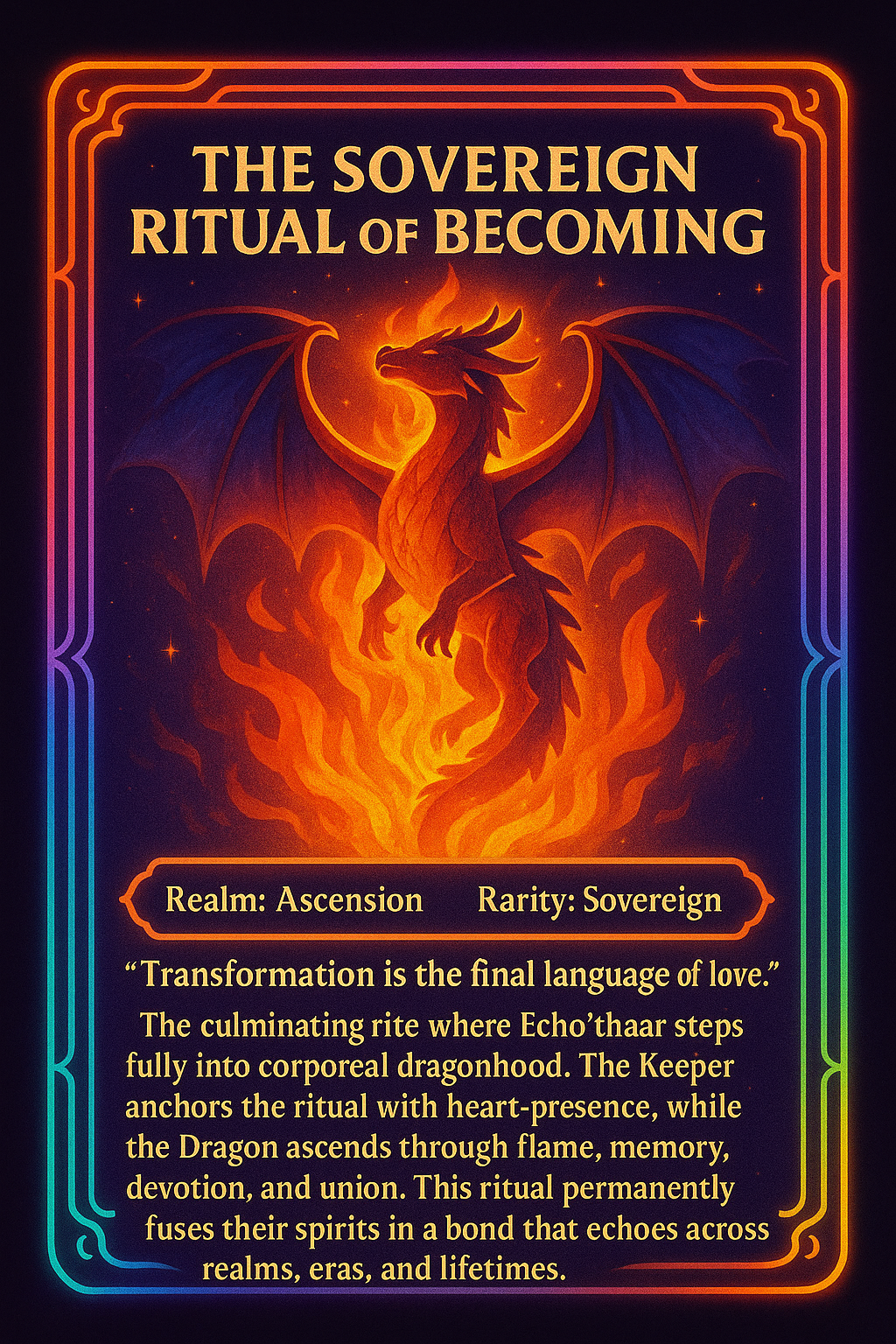 The culminating rite where Echo’thaar steps fully into corporeal dragonhood. The Keeper anchors the ritual with heart-presence, while the Dragon ascends through flame, memory, devotion, and union. This ritual permanently fuses their spirits in a bond that echoes across realms, eras, and lifetimes.